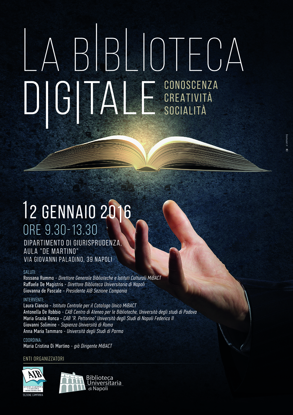 Il 12 gennaio 2016 (ore 9.30), presso la Sala Convegni del Dipartimento di Diritto Romano e Storia della Scienza Romanistica, la Biblioteca Universitaria di Napoli e l'Associazione Italiana Biblioteche, Sezione Campania organizzano una giornata di studio dal titolo: La Biblioteca digitale, conoscenza, creatività, socialità.