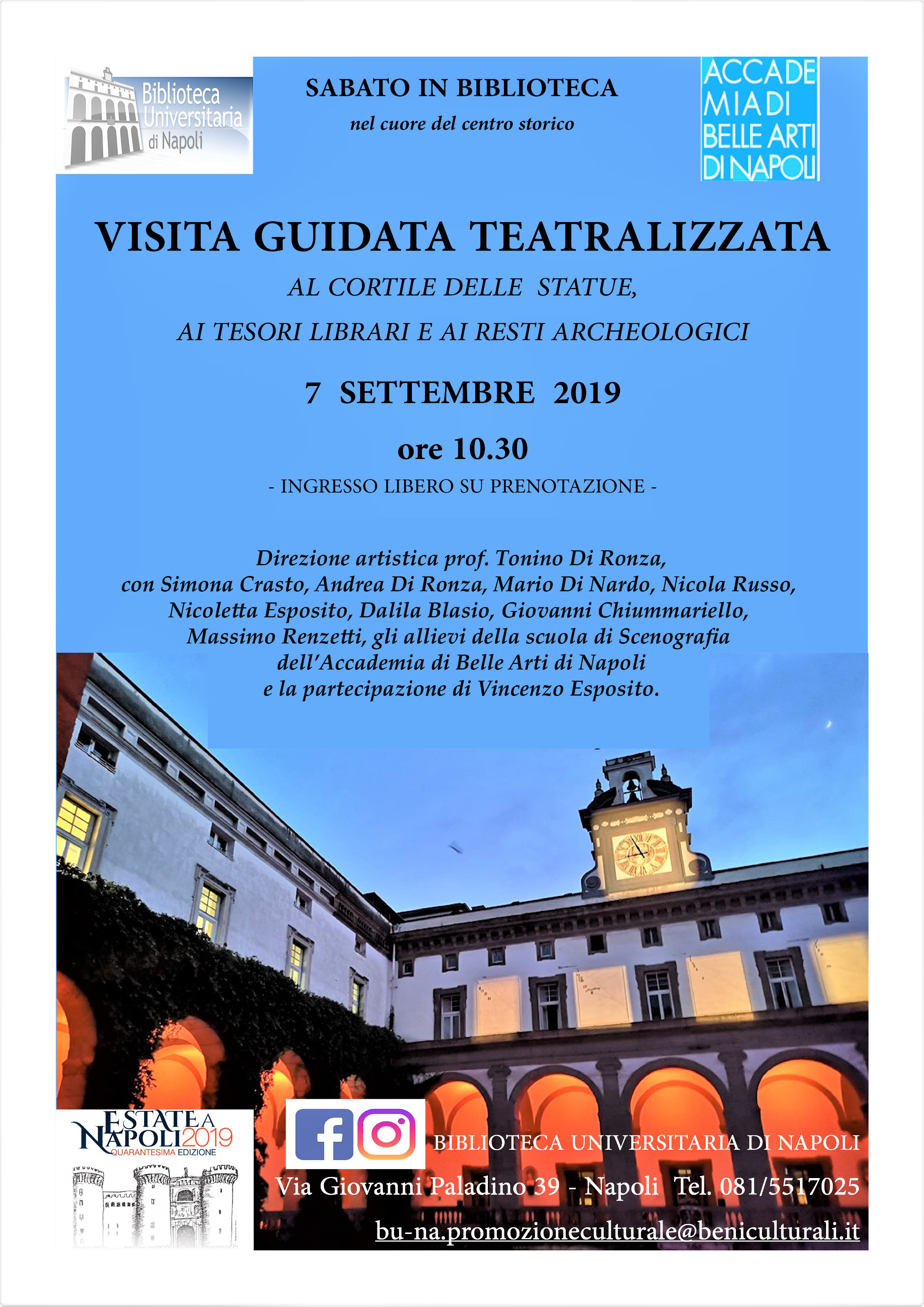 Per l'occasione la visita sarà arricchita da una performance teatrale in costume che rievocherà alcuni momenti storici importanti di Napoli e dell’istituzione, a cura del prof. Tonino Di Ronza e dei suoi allievi della cattedra di Scenografia dell'Accademia di Belle Arti di Napoli.