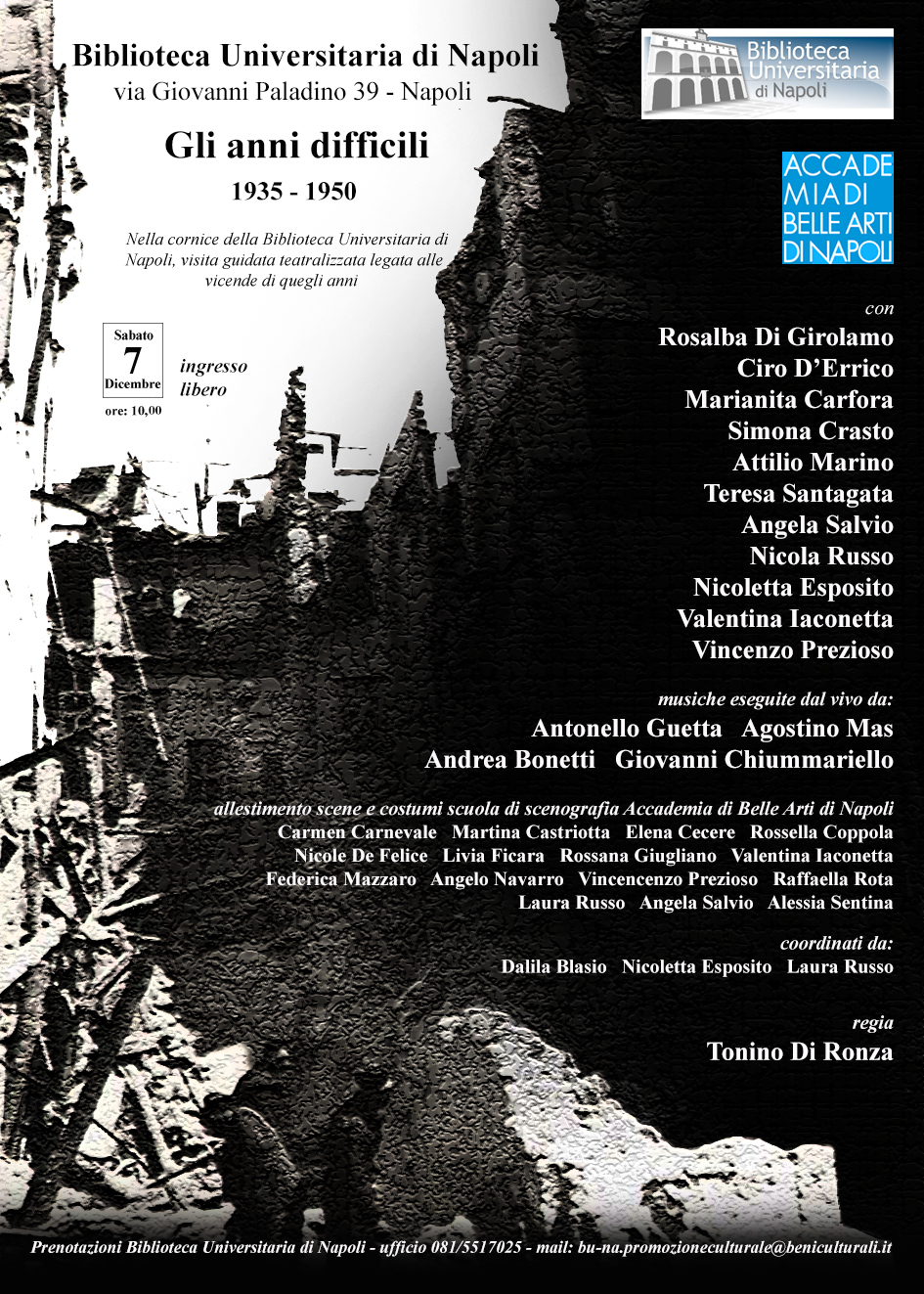La consueta visita guidata del Sabato in Biblioteca sarà arricchita da una performance teatrale dal titolo Gli anni difficili. Le vicissitudini della Biblioteca Universitaria di Napoli nel corso della seconda guerra mondiale, curata dallo scenografo e docente Tonino di Ronza e dagli allievi dell’Accademia di Belle Arti di Napoli.