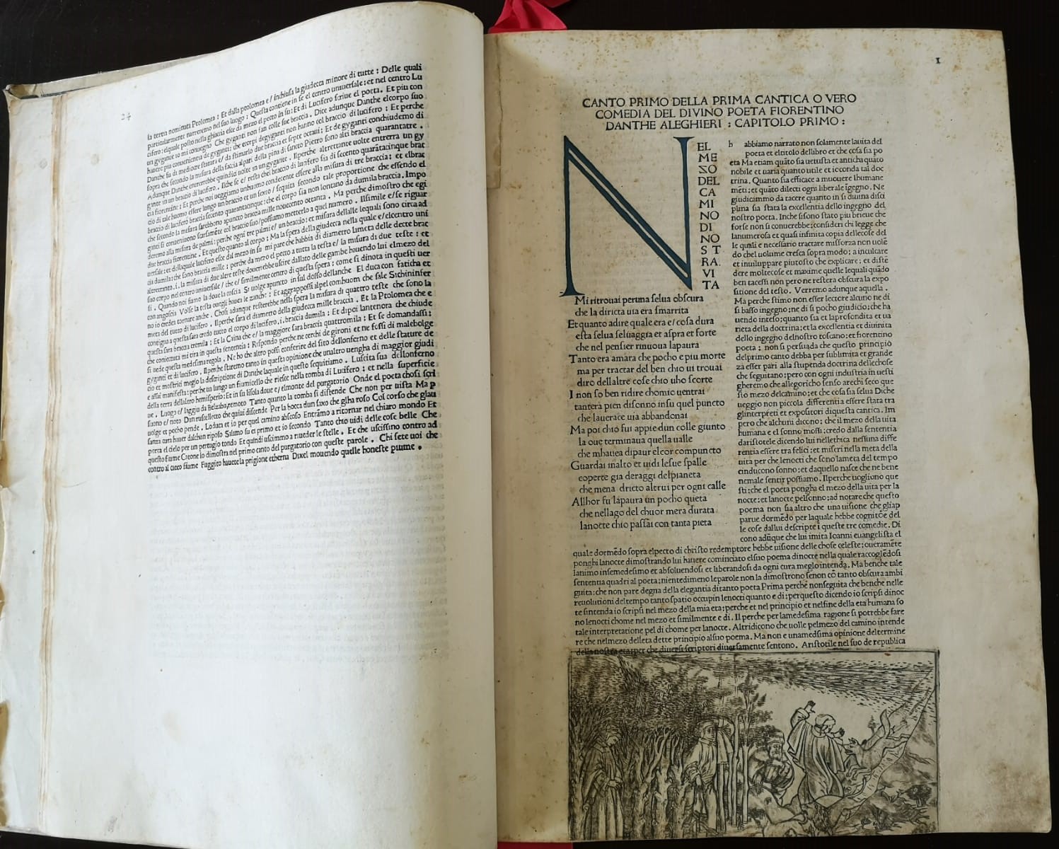 Dante Alighieri, La Commedia (commento Christophorus Landinus). Add: Marsilius Ficinus: Ad Dantem gratulatio. f°. Firenze, Nicolaus Laurentii, Alamanus, 30 Aug. 1481. Prima edizione fiorentina, in 1125 copie, finanziata da Bernardo degli Alberti e stampata da Niccolò di Lorenzo della Magna. È la risposta all'edizione milanese di Nidobeato che la precede di tre anni ed arricchita dal commento di Cristoforo Landino in prefazione. L'edizione in origine prevedeva un corredo di incisioni di Baccio Baldini su disegno di Sandro Botticelli, di cui due sono state realizzate in questa copia. L'opera è legata in pergamena con impressioni in oro e a secco della prima metà dell'Ottocento, con dorso suddiviso in sei riquadri con due tasselli alternati in pelle rossa e nera rispettivamente con nome dell'autore e il titolo.