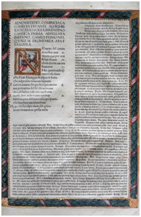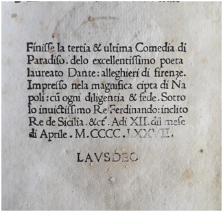 Dante Alighieri, Commedia (commento Martinus Nidobeatus), Milano, Ludovicus e Albertus Pedemontani per Guido Terzagus, 1477-78, f°. Celebre edizione milanese della Commedia, dedicata al marchese di Monferrato Guglielmo VIII Paleologo, altresì nota come Nidobeatina, finanziata dal nobiluomo Guido Terzago e curata dall’umanista novarese Martino Paolo Nibia (Nidobeatus).