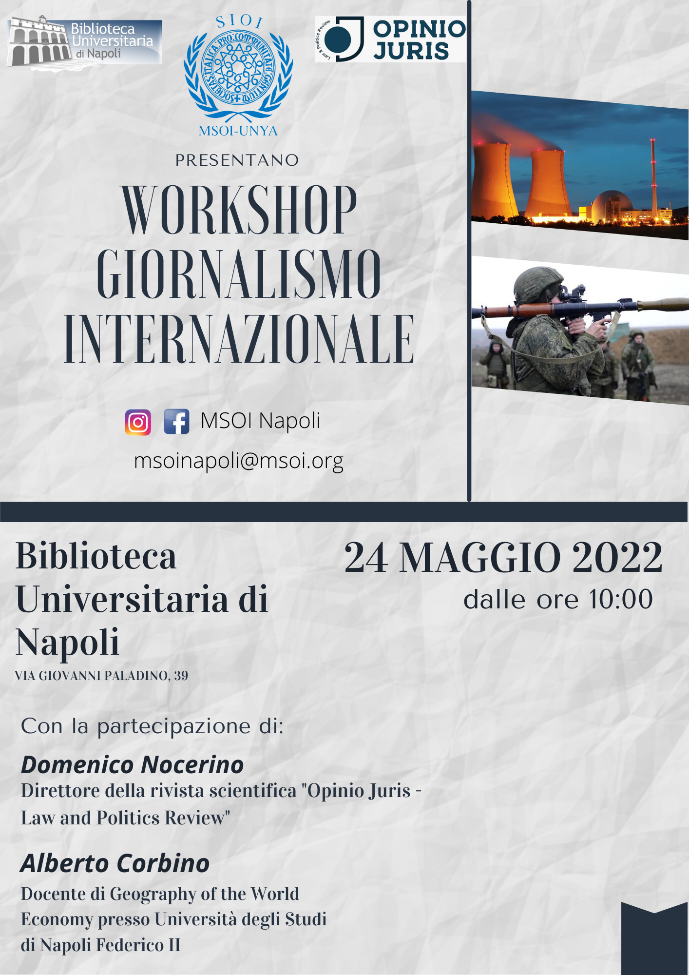 Il 24 maggio alla Biblioteca Universitaria di Napoli si svolgerà la seconda edizione del “Workshop in Giornalismo Internazionale”, organizzato dal MSOI (Movimento Studentesco per l’Organizzazione Internazionale) in collaborazione con la rivista di politica internazionale e diritto.