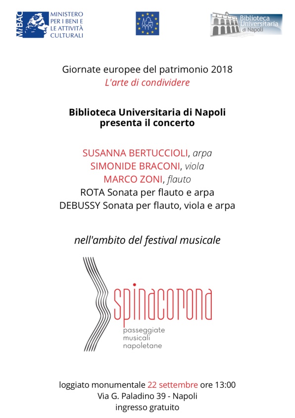 Nell’ambito della seconda edizione del Festival Spinacorona. Passeggiate musicali napoletane, realizzato in collaborazione con l’Assessorato alla Cultura e al Turismo del Comune di Napoli, sotto la direzione artistica dell’ideatore maestro Michele Campanella e il supporto organizzativo della Fondazione Festival Pucciniano (scarica qui il programma), la Biblioteca Universitaria di Napoli presenterà due concerti sul Loggiato Monumentale: